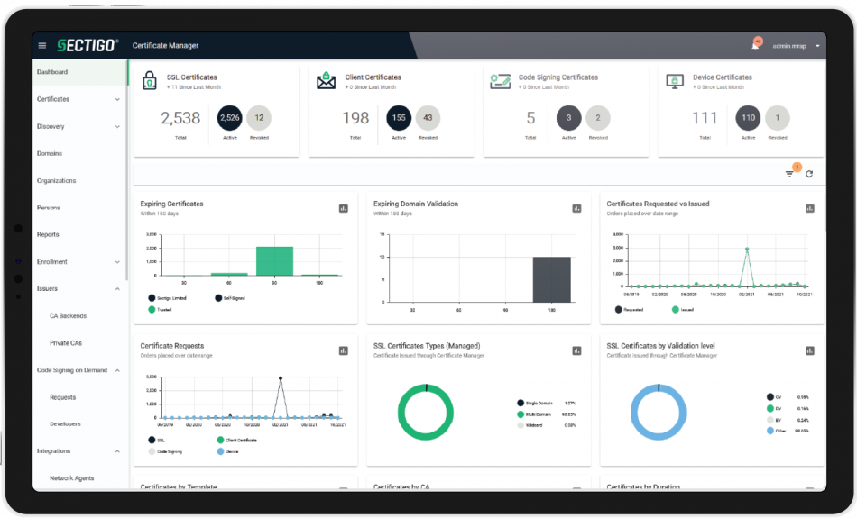 Sectigo Certificate Manager (SCM) is a universal platform purpose-built to manage the lifecycles of digital certificates to secure every human and machine identity across your enterprise, all from a single interface. With SCM you can automate the discovery, issuance, deployment, and management of Sectigo certificates, alongside those from other publicly trusted Certificate Authorities (CAs) and private CAs, including Microsoft AD CS, Google Certificate Authority Service, and AWS Private CA.